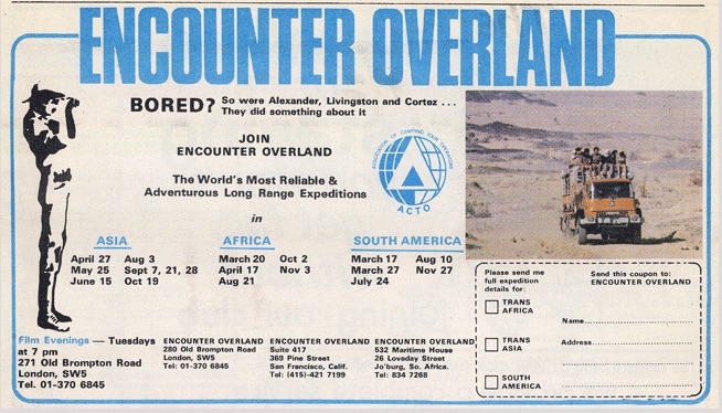 Many articles about overlanding including advertisements for Encounter Overland expeditions. |