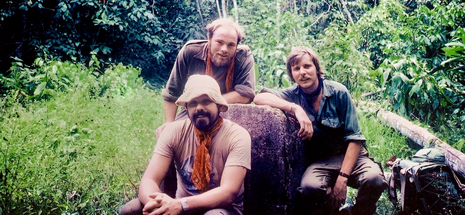 This album is of photos taken on the first crossing of the Darien Gap between Panama and Colombia in Autumn 1982 by an Encounter Overland team consisting of Neal Inwood (rear left), Jerry Creamer (right) and Tony Jones (front). (Photo taken at the border marker between Panama and Colombia.)(See also the 1989 ‘A Tramp in the Darien‘ made by the BBC on the Historical Overland Films page of this website.) |
